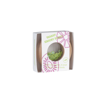 Nuestro nuevo juguete sensorial encantará a los pequeños más golosos. Es un sonajero de madera con forma de donut, ideal para que sus manos lo manipulen con comodidad. En su interior, podréis identificar figuras de frutas y verduras, que al agitarse desatan el irresistible sonido marca de la casa. Aunque apetece comérselo, está hecho de madera de haya natural, libre de tóxicos y a prueba de mordiscos.