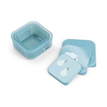Material Caja: 100% PP de grado alimenticio. Tapa: 100% PE de grado alimenticio. Color Azul Tamaño 8,9 x 8,9 x 4,5 cm & 10,3 x 10,3 x 5,1 cm & 11,8 x 11,8 x 5,5 cm. Capacidad 240 ml, 370 ml, 540 ml. Cuidado Apto para el lavavajillas, máx. 70°C, solo rejilla superior. Apto para microondas (quitar la tapa). Apto para congelador.