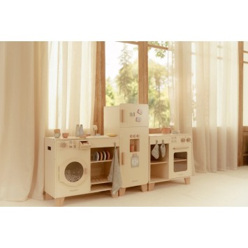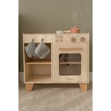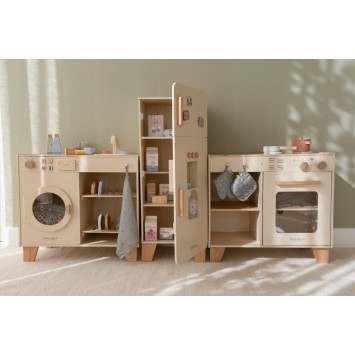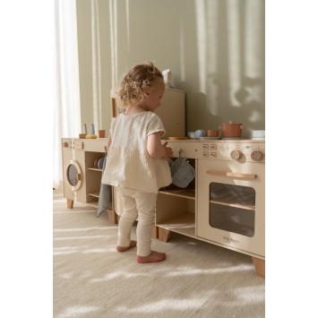 ¡Atención, pequeños chefs! Esta preciosa estación de cocina de madera es perfecta para preparar las comidas más deliciosas. Hornee un pastel o cocine verduras frescas en el horno. El set incluye dos sartenes, una manopla y un paño, y está equipado con botones con ilustraciones para mayor realismo. Combine la cocina con el refrigerador o el set de lavadora y lavavajillas para crear una cocina de juguete completa. ¿Qué hay en el menú de hoy?
