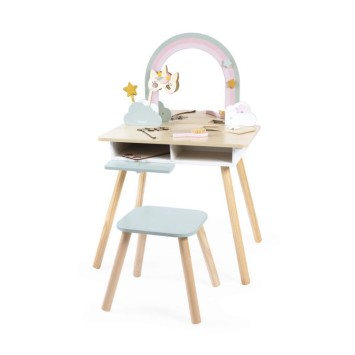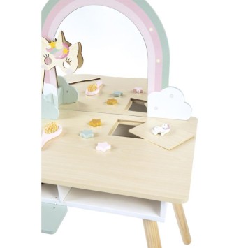 Este gran tocador, su taburete y sus numerosos accesorios ofrecerán a su hijo un auténtico mundo de juego y creatividad. ¡Es mágico! Tiene una trampilla secreta magnética para esconder sus pequeños secretos. ¡También tiene 3 accesorios para fotomatón para pasar horas divirtiéndose! 4 imanes con forma de estrellas y unicornios, un auténtico cepillo del pelo e, incluso, una varita mágica añaden un toque de magia a cada sesión de juego. ¡Con este tocador, su hijo estimulará su imaginación, se arreglará y se divertirá como los mayores! Juguete de imitación de madera FSCTM para niños a partir de 3 años.