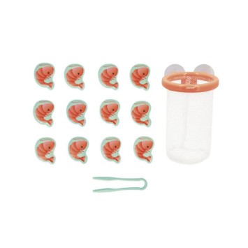 12 gambitas se han escapado en el baño, ¡hay que atraparlas rápidamente! Gracias a las pinzas su hijo podrá pescar cada una de las gambas que flotan en la superficie del agua y colocarlas en una bonita cesta que se fija en la loza gracias a sus ventosas. Este juego le permitirá a su hijo desarrollar la destreza mientras se divierte en el baño. Juguete para el baño para niños a partir de 2 años.