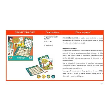 DESCRIPCIÓN -Un juego de localización en el espacio en el que hay que encontrar la posición de los 5 animales en relación con los 5 elementos del decorado y colocar las fichas en el tablero. ¿Dónde está el ratón? ¡Está en el cubo! ¡Un juego sencillo y divertido! Para comprobar si las fichas están correctamente colocadas en el tablero, basta con consultar la solución indicada en el reverso de la carta. -Un juego original para aprender a situarse en el espacio. -El juego se basa en un tablero de doble entrada, como el que se usa en el jardín de infancia. -Permite la autocorrección gracias a las soluciones proporcionadas en el reverso de las cartas. -Unas reglas del juego muy detalladas, para ayudar a los padres a poner en marcha la actividad más fácilmente. Disponible en 10 idiomas. Contenido: 1 tablero de madera, 20 cartas de desafío con la solución en el reverso y 5 fichas de madera. Reglas del juego en 10 idiomas. Edad: A partir de 4 años Número de jugadores: Medidas producto: 20x20cm Medidas packaging: 21,5x21,5x3cm
