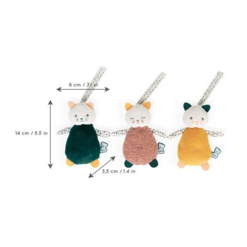 Desarrollado en colaboración con psicomotricistas, este juego de tres gatitos de peluche es ideal para desarrollar el tacto del bebé. Pesado, ligero, rizado, tupido o con sonido, cada gatito tiene sus propias peculiaridades que el bebé disfrutará sintiendo y descubriendo para un enriquecedor y variado juego sensorial. Desde el nacimiento. Puntos fuertes : - Desarrolla el agarre preciso - Telas con diferentes texturas para que el bebé se familiarice con diversas sensaciones táctiles - Colores y estampado de lunares con contraste para desarrollar la vista del bebé - Cintas para colgarlo en cualquier lugar Consejo: Deje que el bebé descubra por sí mismo los diferentes tactos colocando los gatitos cerca de él. De esta forma, desarrollará sus habilidades sensoriomotrices. Descubra otros productos de la gama Stimuli de Kaloo para acompañar a su hijo durante todo su desarrollo a través de los llamados juegos sensoriomotrices