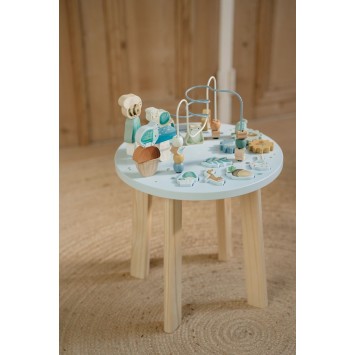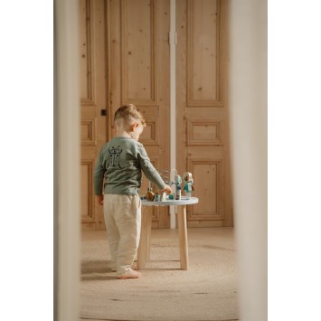 ¡Ponte de pie para jugar! Descubre las numerosas actividades que ofrece esta mesa. Lleva las cuentas a lo largo de la espiral de un lado al otro del bosque encantado o construye una torre y llena el bosque de árboles de alegría. Completa el puzle, gira las ruedas y ayuda a los adorables animales a cruzar los bosques de Forest Friends. Esta mesa de actividades múltiples de madera desafía a tu pequeño de muchas maneras. Hay 5 actividades para explorar que apoyan el desarrollo de las habilidades motoras finas. Gracias al diseño seguro y equilibrado, la mesa de actividades también fomenta que se ponga de pie. ¡Y que se mantenga levantado! Porque las numerosas funciones mantendrán a tu pequeño entretenido durante un rato. Requiere montaje por parte de un adulto.