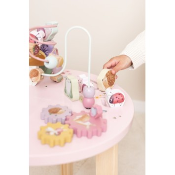 ¡Ponte de pie para jugar! Descubre las numerosas actividades que ofrece esta mesa. Lleva las cuentas por la espiral de un lado al otro del jardín mágico o construye una torre y llena el jardín de flores y alegría. Completa el rompecabezas, gira las ruedas y ayuda a los adorables animales a cruzar el jardín de hadas. Esta mesa de madera multiactividades desafía a tu pequeño de muchas maneras. Hay 5 actividades para explorar que fomentan el desarrollo de las habilidades motoras finas. Gracias al diseño seguro y equilibrado, la mesa de actividades también fomenta que se ponga de pie. ¡Y que se mantenga levantado! Porque las numerosas funciones mantendrán a tu pequeño entretenido durante un rato. Requiere montaje por parte de un adulto.