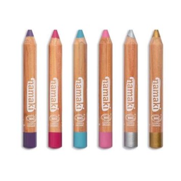 NEGRO-AZUL-VERDE-DORADO-PLATA-ROJO Pack de 6 lápices de maquillaje de Namaki con los que decorar la cara y el cuerpo de los peques para sus fiestas de disfraces preferidas.