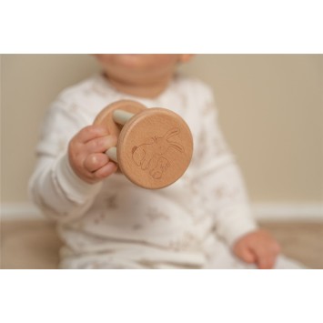 ¡Rueda y haz sonar el sonajero! Sigue haciendo rodar este sonajero de madera y el tintineo de la campana continúa. Intenta agarrarlo y agitar el sonajero hacia adelante y hacia atrás para obtener sonidos aún más alegres. Un fantástico juguete con el simpático diseño del conejito de la colección Baby Bunny para favorecer la coordinación mano-ojo.
