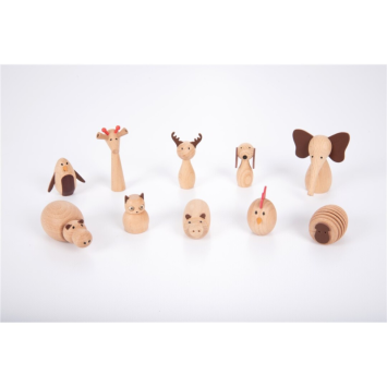 El juego contiene: 10 animales de madera en una bolsa de algodón con cordón. Tamaño: Aprox. Alto 4 cm - 7 cm. Edad: No apto para niños menores de 3 años.